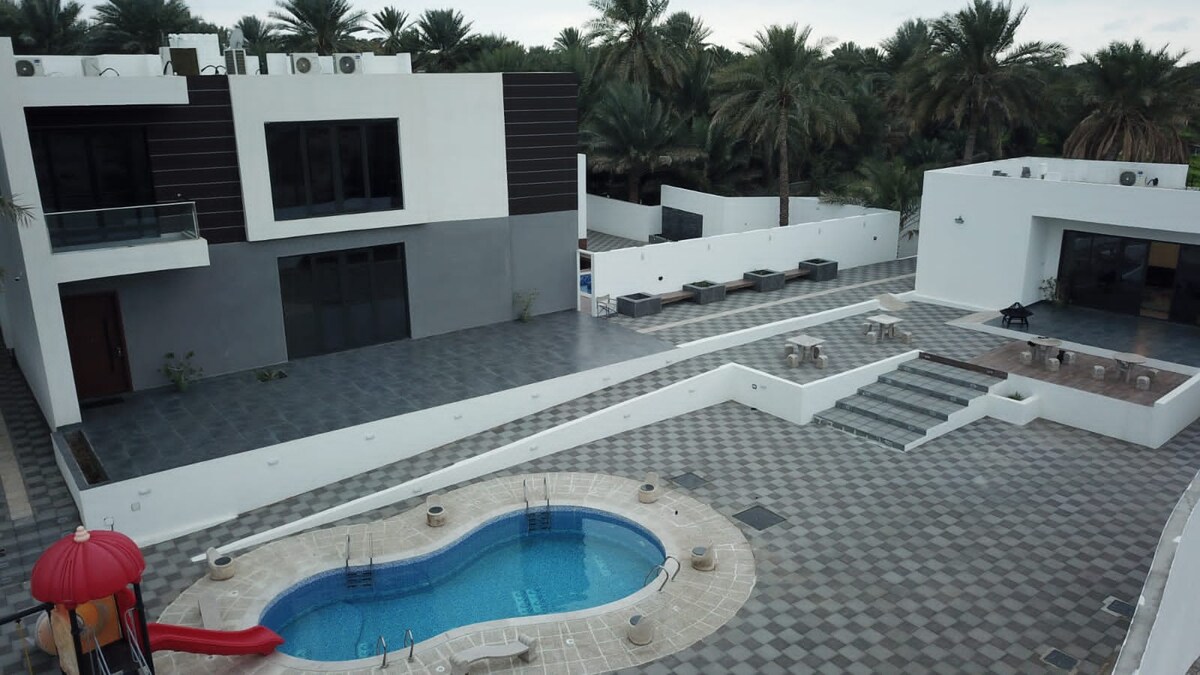 The Jabal Villa عدد الغرف ٤ (٣ غرف + ١ جناح) *الطابق الأرضي* -غرفه ذو سرير كبير+دورة مياه -مطبخ -صاله -طاولة طعام -دورة مياه —- *الطابق الأول* -غرفه ماستر + (دورة مياه + بلكونة) -غرفه ذو سريرين منفصلين + حمام -غرفه ذو سريرين منفصلين ( حمام خارجي) -صالة تلفاز + دورة مياه *مرافق خارجية:* -حوض سباحة مع سخان -مكان للشوي -مواقف خاصة *ملاحظة:* متوفر مصعد لسهولة الانتقال بين ملاحظه عدد النزلاء كحد اقصى ١٢ شخص 🛑