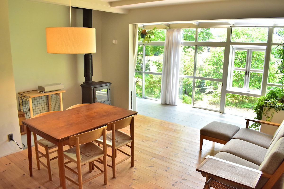 一栋注重简约和设计的整租旅馆。请您一边欣赏自然的庭院,一边度过悠闲的时光。