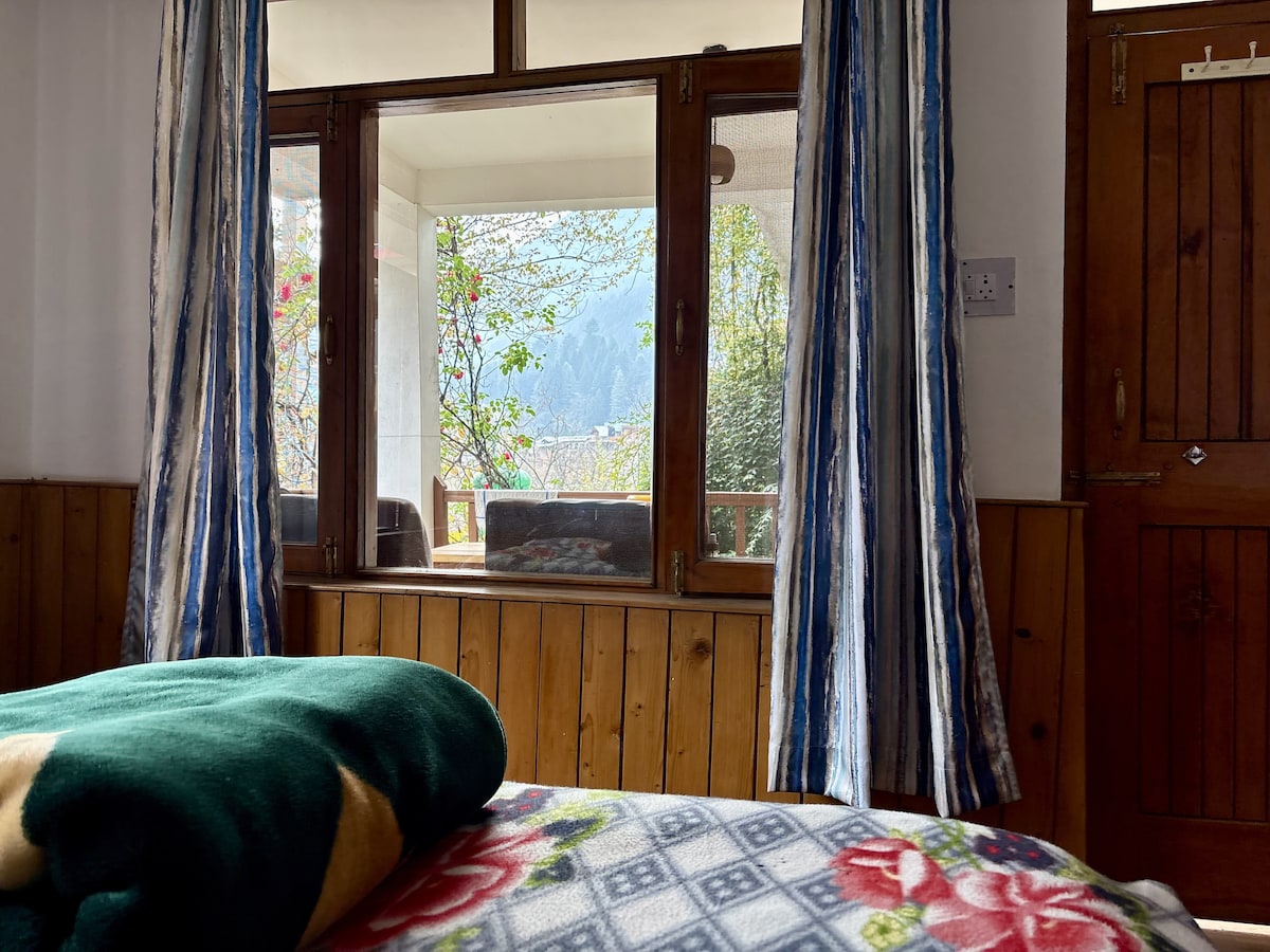 Super cozy Duplex Suite WITH WINDOWS for mountain view. One bedroom on lower level with one washroom and a wooden stairs to upper level bedroom. it has a sofa set on upper level where 4-5 guest can sit and enjoy food. ROOM INCLUSIONS : -Comp Mineral water on arrival -Free WI-FI , parking Free Breakfast (Morning 8.30 till 10.30am)served at dining area only (No Room Service) -Heater at additional 300/- rs charge Room is on 3rd Floor Note *No provision of lift*