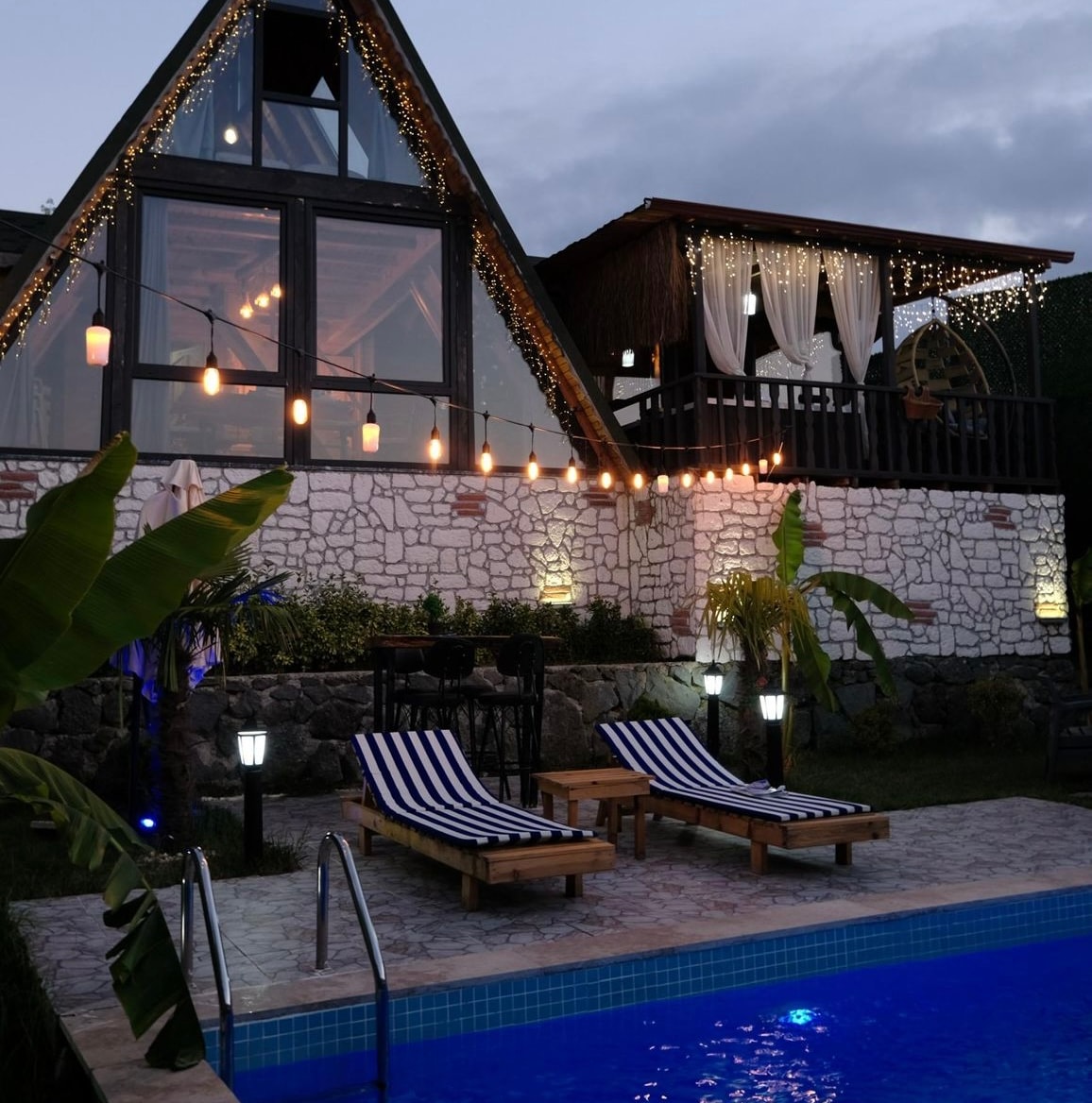Şehrin stresinden uzak, doğanın kalbinde yer alan özel ahşap evimiz; zarif tasarımı, özel yüzme havuzu ve geniş bahçesiyle misafirlerine unutulmaz bir konaklama sunuyor. Tamamen size özel alanınızda, sabahları kuş sesleri eşliğinde uyanabilir, gün boyu havuz kenarında güneşlenip akşamları yıldızların altında keyifli anlar yaşayabilirsiniz. Modern ve konforlu detaylarla tasarlanan evimiz, doğanın huzurunu lüks bir konforla buluşturuyor.