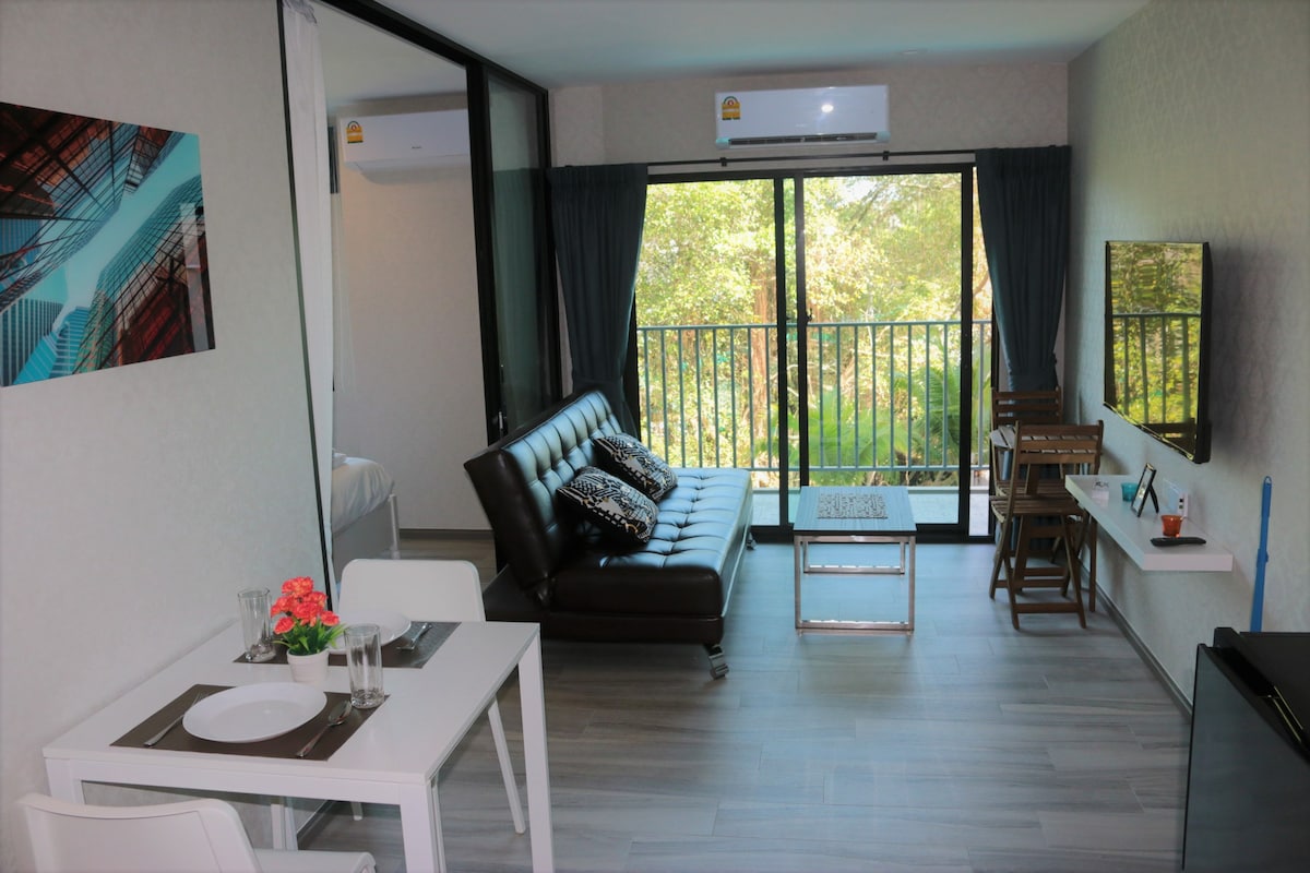 The renovate apartment with 32 Sqm, Medium in size at the 7th floor which building designed on small mountain. The place private and peaceful near Naiyang Beach 📍Highlight Area - Paronama View from the room - Walk 5 min to Bus stop station to the town - Drive 5 min, walk 15 min to Naiyang Beach & National Park - Drive 7 min, walk 30 min to Phuket International Airport #Free Wifi #Fully equipped for stay #Monthly Stay, Price exclude electrical & water charge, Free cleaning 1 time per week