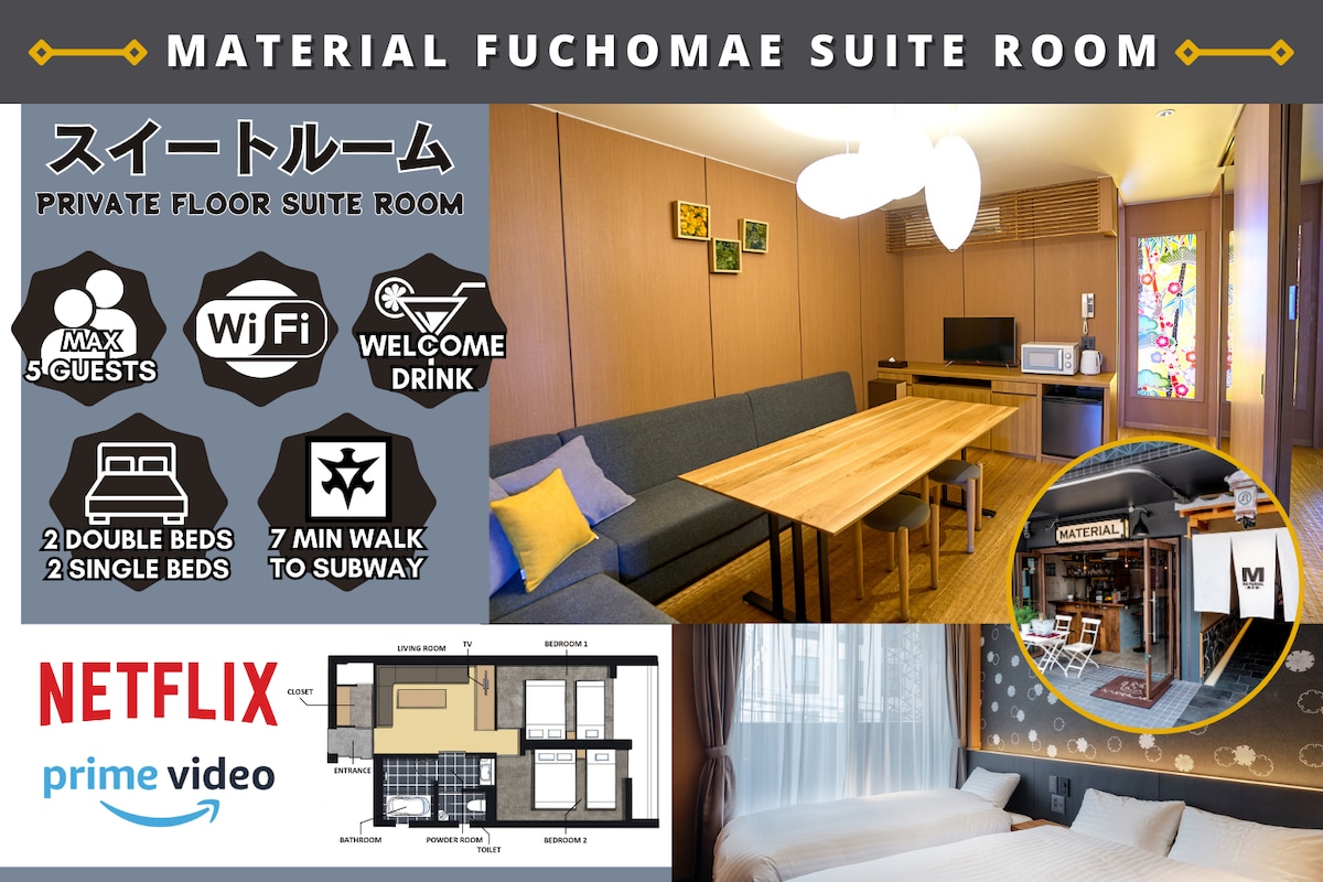 Luxury Penthouse of MATERIAL Fucho-mae is a duplex room. 2 bedrooms, 2 luxury Bathrooms, Living room with a kitchen, 2 toilets The whole 2 stories apartment is all yours during your stay. Well equipped and recommended for a long term stay. We provide towels from Japanese famous towel brand 【Imabari】Hotel series. We provide duvet from Japanese popular duvet maker 【Nishikawa】Down Comforter. Small authentic bar "Bar MATERIAL" on the ground floor. Each guest can enjoy "welcome drink" at our bar.