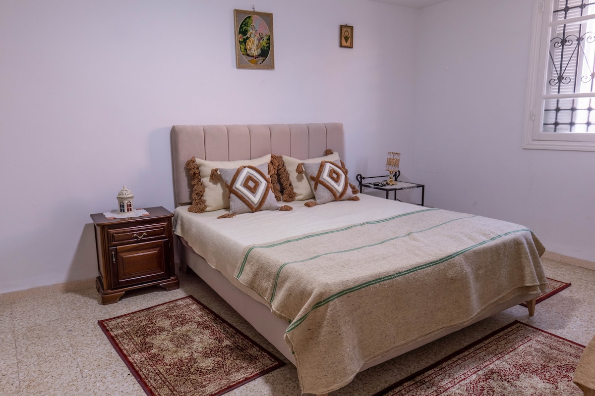 A quelques pas de la plage, ce logement paisible offre un séjour détente pour toute la famille ou les amis. Comportant un sejour et sa magnifique terrasse fleurie, ombragée par la vigne et une chambre double, il peut loger 4 personnes. Agréable en toute saison, la Chebba offre tous les services et un poisson au goût inégalé.