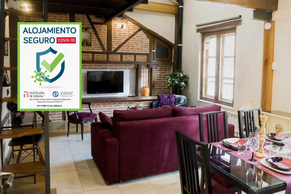 Apartamento de lujo a estrenar y al mejor precio. Situado en la calle Concejo a un minuto de la Plaza Mayor de Salamanca. Una vivienda ideal para una pareja que desee vivir con las características de un hotel 5 estrellas, servicio de limpieza, wifi, Netflix, chimenea... Un apartamento perfecto para relajarte y al mismo tiempo vivir en pleno centro, al salir del apartamento lo primero que te encuentras es el arco de la Plaza Mayor.