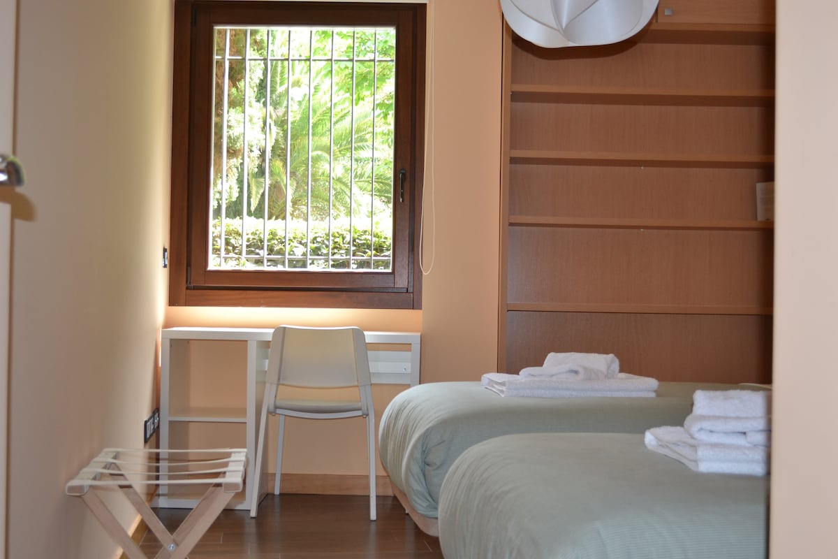 Chalet adosado de dos plantas con terraza, jardín privado y piscina comunitaria en verano. Tiene WiFi rápida (300 mbps), calefacción propia y ajustable y colchones de calidad (Flex). Está en una zona tranquila con aparcamiento gratuito libre en los alrededores, a 200 metros de la parada de autobús, y a 50 metros de un parque infantil, una cafetería y una tienda de alimentación. Es posible ir al centro dando un paseo, al estar a 2 Km a pie de la Catedral de Salamanca.
