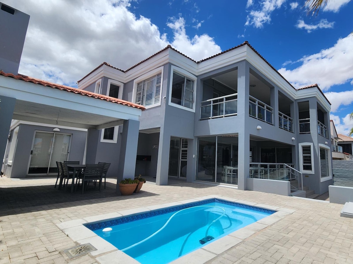 Beachfront villa with INVERTER. Walking distance to 3 beachfront restaurants, Kokomo, Friday Island, and Wunderbar. Langebaan Waterfront close by. PET FRIENDLY & INFINITY / PARTY TYPE POOL ON THE BEACH. Viewing sundeck, a braai/barbeque area protected from the South Eastern wind, and uninterrupted views of the Kite, Surfing, and SUP activities of the close by Cape Sports Centre. On the doorstep of stunning Langebaan Lagoon Driving distance to Sharks Bay, an island-style idyllic kiting bay.