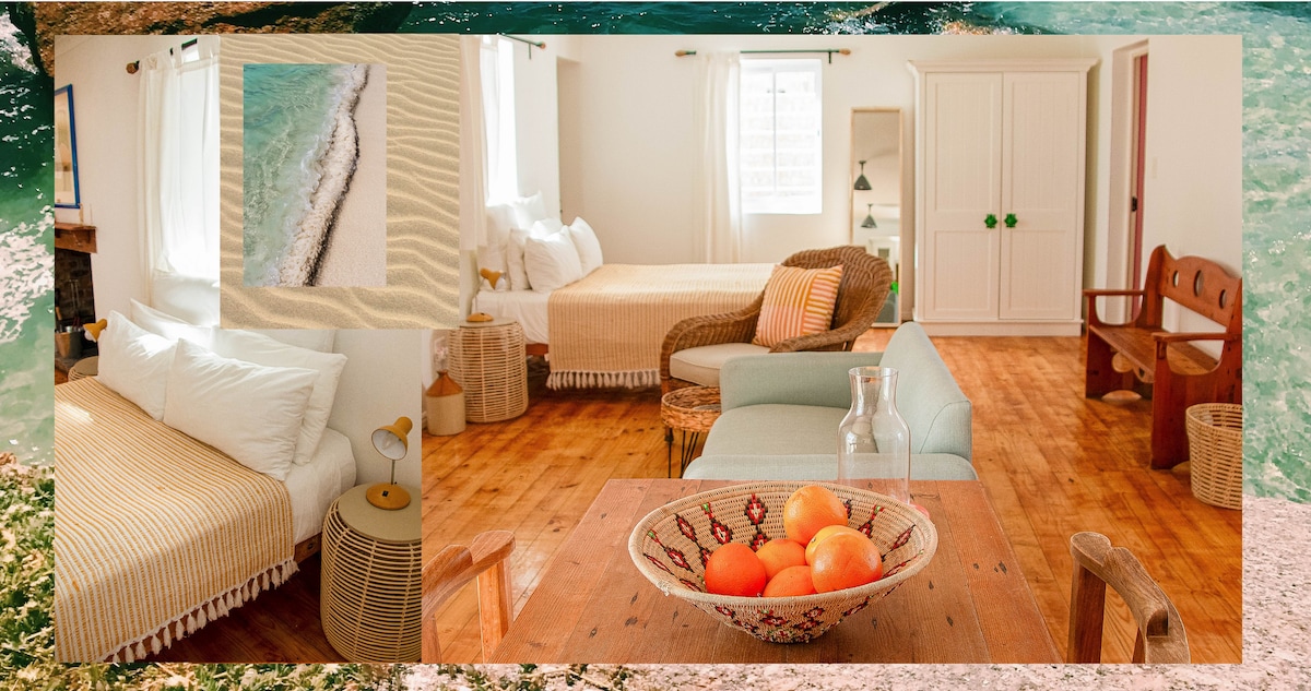 Peaceful only begins to describe this well-situated beachfront house. Beautiful open plan house with rooms that are separated from the main space. Each room has its own kitchenette with tableware provided. All rooms have a beach front view with their own patio in front. The rooms walk out to a central courtyard that connects to the main space. You could easily spend the whole day on the front patio and admire the beautiful scenery. House is equipped with backup power.