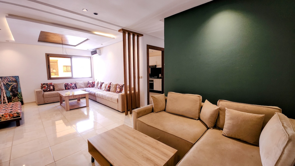 Profitez d’un appartement calme et moderne , idéalement situé à seulement 5 min de l’aéroport de Rabat. Savourez votre café sur une agréable terrasse ensoleillée. La station de tram est à 5 min à pied, vous reliant rapidement aux quartiers d’Agdal et Hay Riad (15 min),5 min de technopolis et l’UIR . Le logement dispose d’une climatisation centrale desservant toutes les chambres, garantissant un confort optimal en été comme en hiver. Un cadre parfait pour un séjour détente ou professionnel.