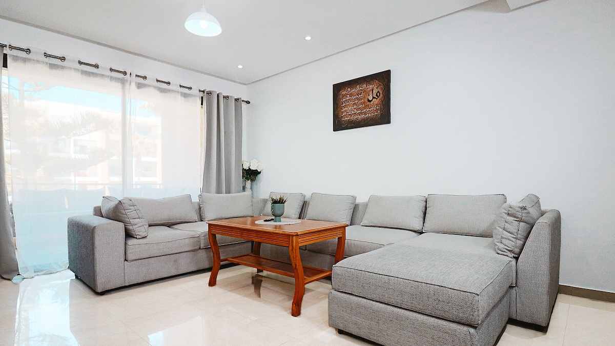 Séjournez dans un appartement haut standing, élégant et lumineux à Salé, à proximité du tram et à env. 7 min à pied de la gare de Salé-Tabriquet. Train direct vers Rabat Hay Riad, pratique pour rejoindre les stades pendant la CAN. 🛋️ Salon spacieux avec TV 65", Netflix & IPTV 🛏️ Suite parentale + 2ᵉ chambre 🍽️ Cuisine équipée • 🌿 Balcon 🏊 Résidence calme et sécurisée 24h/24 📶 Fibre rapide • 🚗 Parking + garage en option • ❄️ Clim en option
