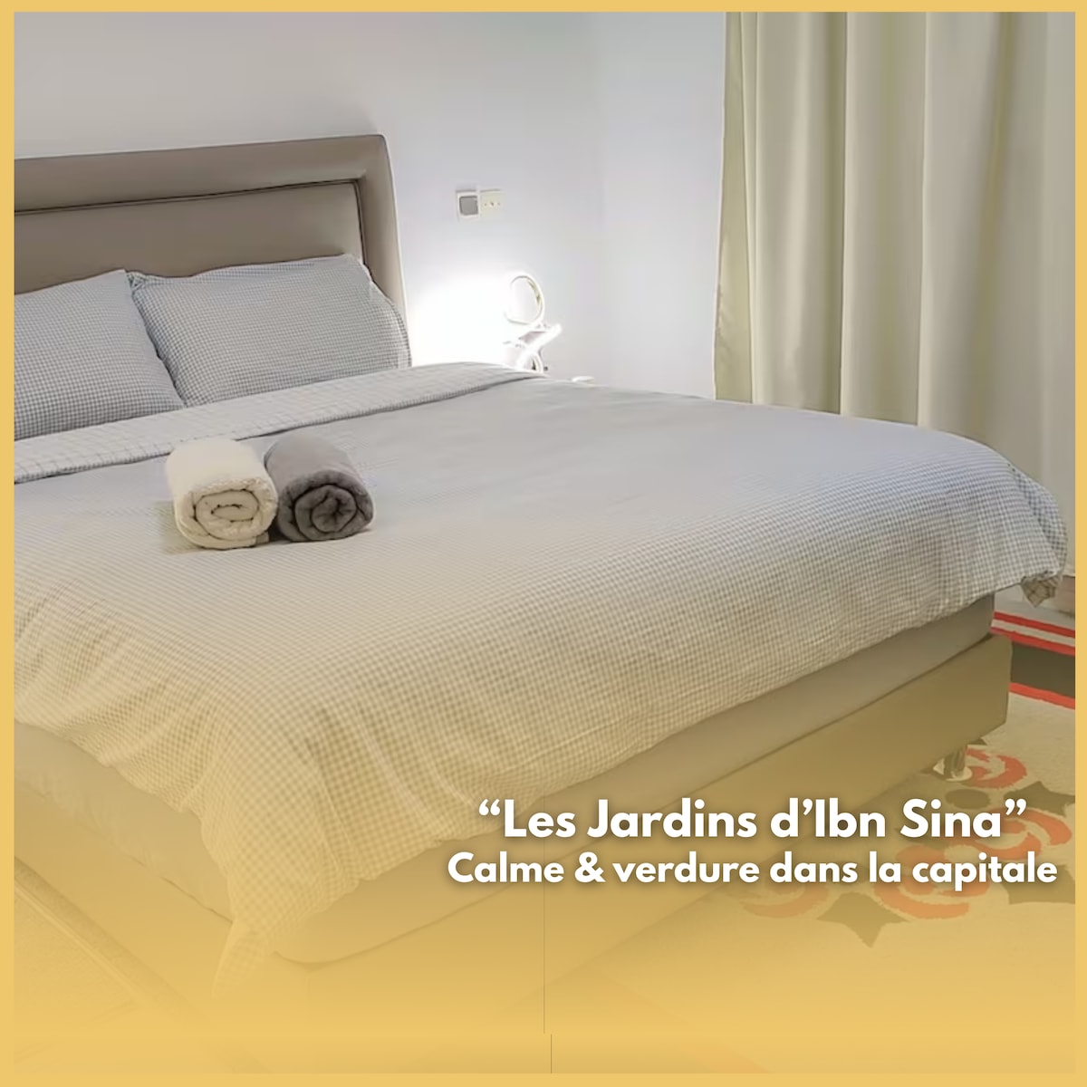 Les Jardins d’Ibn Sina, un appartement calme et bien entretenu situé dans le Haut Agdal, à proximité immédiate de la forêt urbaine Ibn Sina. Un cadre agréable, fonctionnel et confortable, idéal pour séjours professionnels, médicaux ou urbains au cœur de la capitale. 👥 Idéal pour 2 voyageurs 🌳 Quartier résidentiel