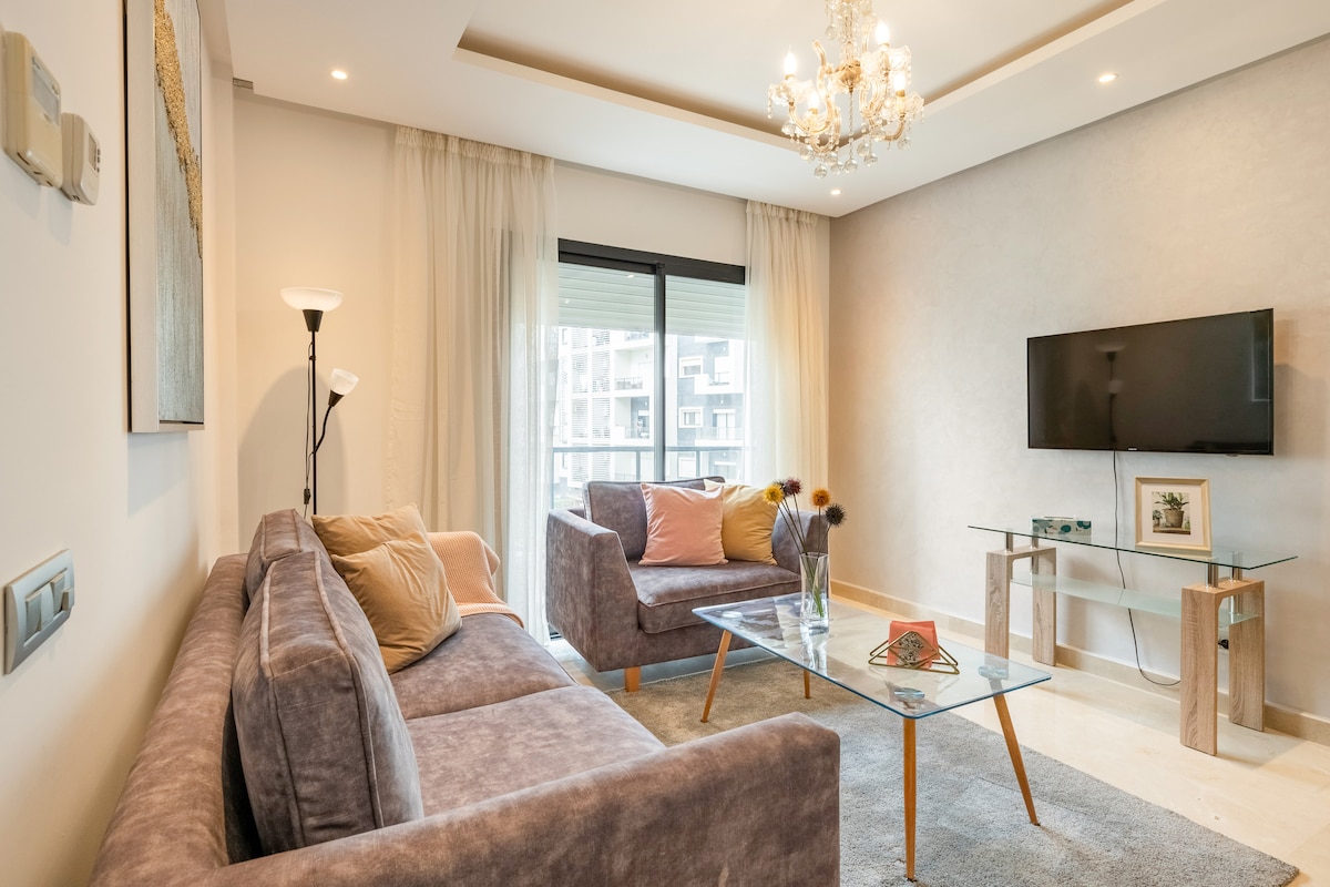 Experience a blend of comfort and elegance in this newly renovated 2-bedroom apt. Bright, spacious, and inviting, it offers a warm and stylish ambiance. Enjoy 24/7 security, private parking, and a lively neighbourhood filled with cafes, restaurants, grocery stores, and a nearby children's park. Unwind on the large terrace with stunning views. Stay entertained with Netflix and connected with high-speed WiFi. Ideal for families or anyone seeking a peaceful yet vibrant stay in the heart of Rabat.