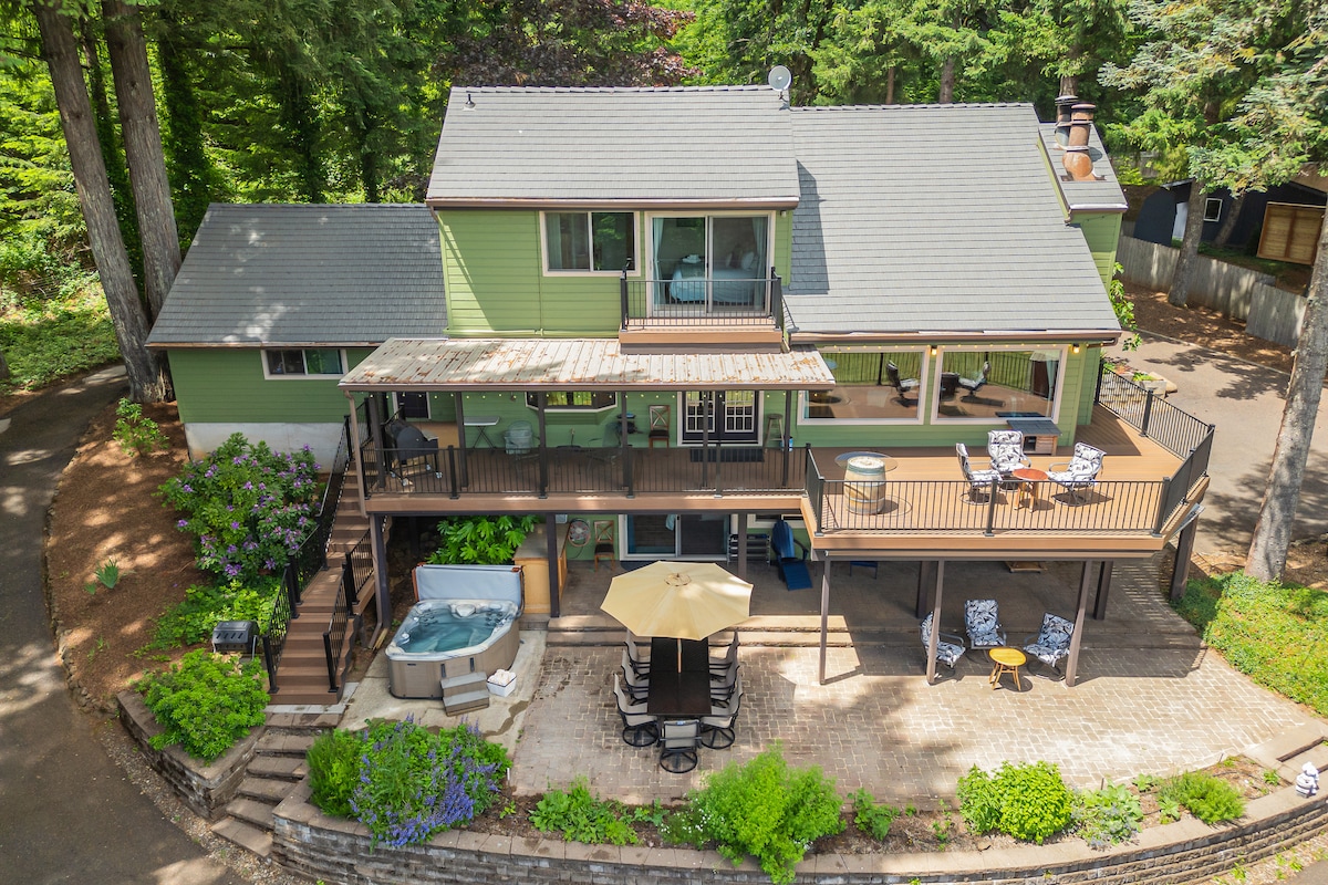Our large (1,500sq ft) space (private access), has a bedroom, bathroom, living room w/ a fireplace, hot tub, full gym as well as a kitchenette w/ full sized fridge, keurig, microwave, air fryer, toaster oven, single burner, and laundry facility. Smart tvs, hammocks and a rooftop firepit are in the outdoor entertainment area. LGBT & BIPOC friendly. Gym, hot tub and laundry are shared with owners but guests have priority access. Close to Mt Hood Wilderness (45mins) & Downtown Portland (15mins).