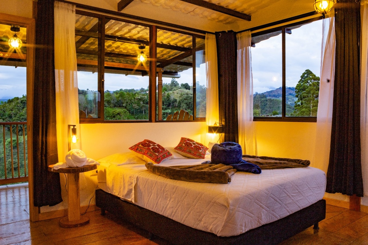 Sumérgete en la tranquilidad de Calarcá, Quindío. Nuestra suite exclusiva te espera con un jacuzzi privado para un descanso total. Disfruta un ambiente acogedor con encanto rústico y una vista inigualable a las verdes montañas del Quindío. Ubicados estratégicamente cerca de atracciones icónicas: Parque del Café, Panaca, Mariposario y a un paso de Salento y el Valle de Cocora. Relájate en esta escapada única y tranquila. ¡Tu escape romántico ideal en el corazón del Eje Cafetero te espera!