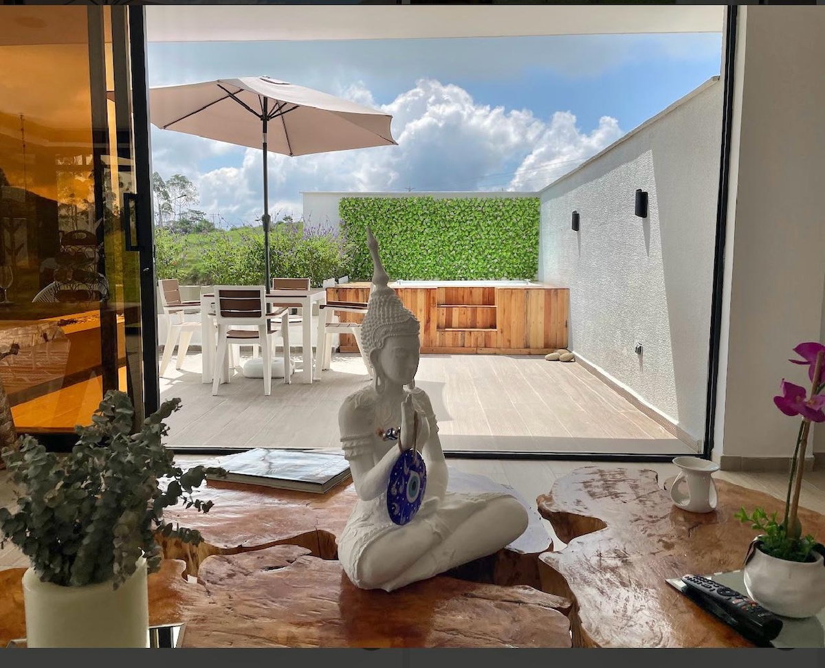 At Casa Chica Duarte, you’ll experience a getaway full of natural charm. Located just minutes from Quindío’s top tourist attractions, this industrial-style home is the perfect place for those seeking relaxation, comfort, and a deep connection with nature. Imagine moving from a cozy BBQ area to a social space with a fireplace, where the surrounding landscape takes center stage. Just ahead, a peaceful inner courtyard leads you to a bedroom designed for complete rest. We can’t wait to host you!