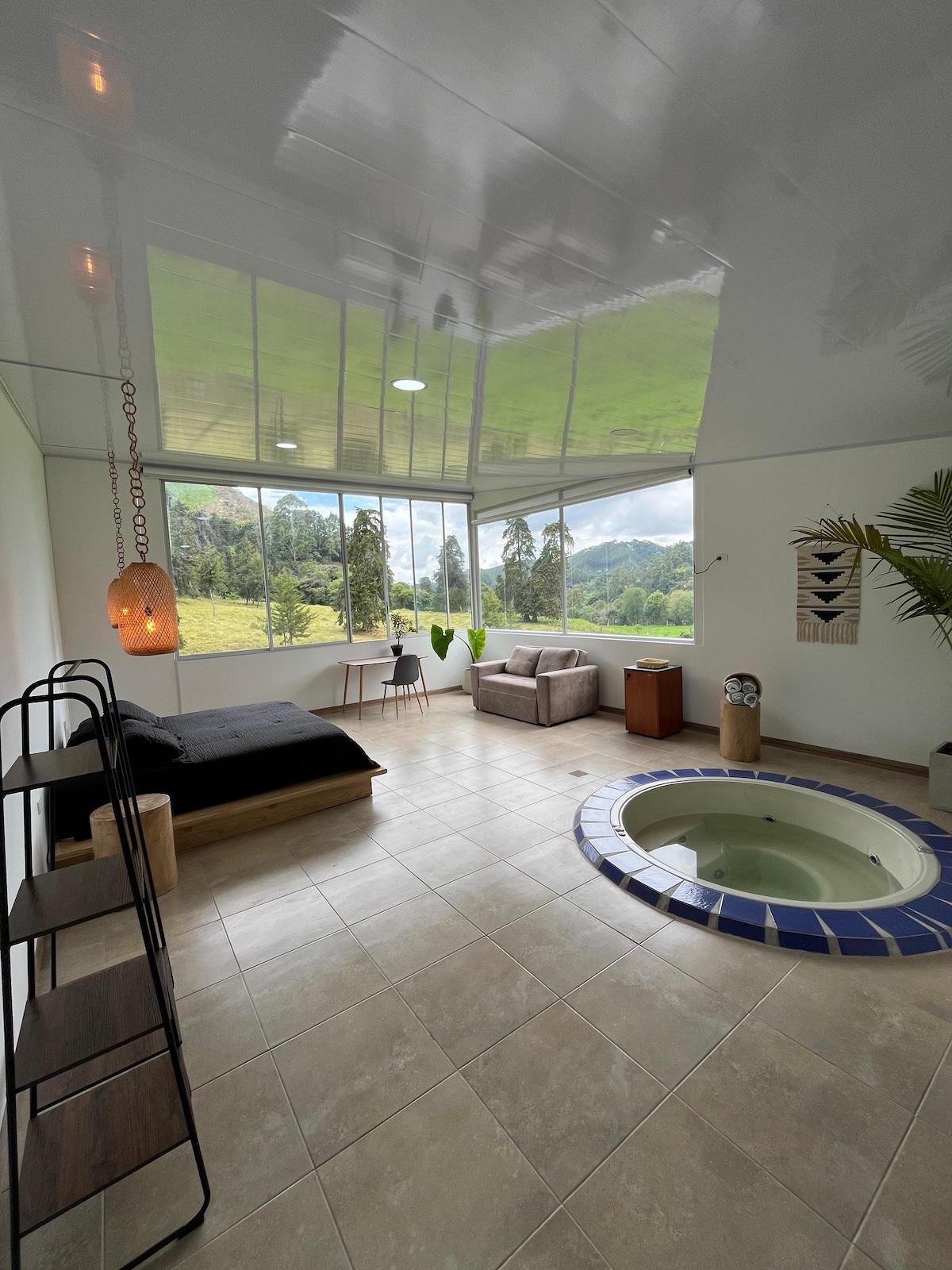 Suite Presidencial amplia y elegante con cama King 2x2, jacuzzi privado y una vista privilegiada al paisaje cafetero. Un espacio pensado para el descanso total, donde el confort, la privacidad y la amplitud se combinan para crear una experiencia especial en medio de la naturaleza. Ideal para desconectarse, celebrar ocasiones especiales y disfrutar del encanto único de Salento.