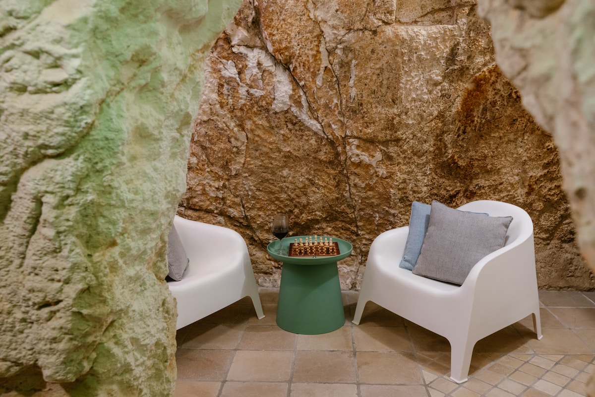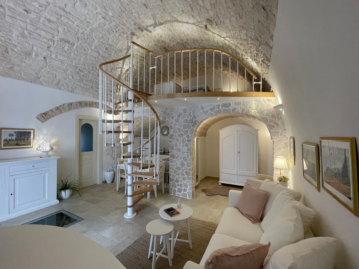 This unique space, carved inside traditional trulli, has its own charm and lets you experience the true spirit of the Itria Valley. You enter through an old strawberry‑grape pergola. The kitchen and bathroom are set in the alcoves, while the dining and sleeping areas are located in a saracen trullo and a tall‑cone trullo. The private patio and nearby infinity‑edge pool offer views of the valley and the skyline of Ceglie Messapica.