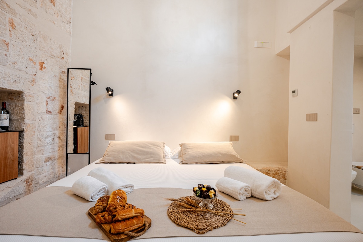 Suite 101 – La Stanza dell’Acqua Suite privata situata all’interno dell’antico insediamento Il Chiostro dei Medici, nel centro di Alberobello, Patrimonio UNESCO, con accesso pedonale dal giardino di Via A. Agrusti. La suite nasce da ambienti di servizio storicamente legati all’acqua e al ristoro di pellegrini e abitanti del luogo diretti ai Santi Medici Cosma e Damiano, e presenta soffitto piano, una parete in pietra calcarea, affaccio sul giardino interno del Chiostro e finestre sui trulli.