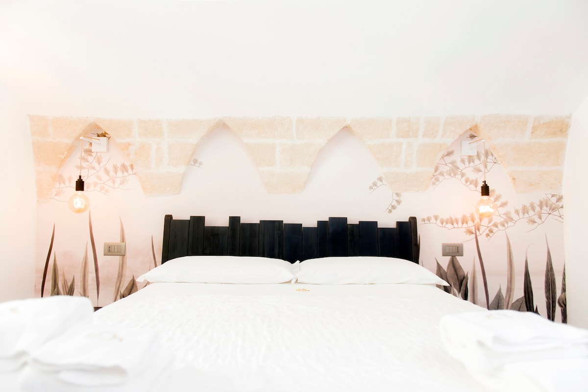 Passeggiando per le vie di un piccolo paesino, Sannicola, nel cuore del Salento, una scalinata di un palazzotto di fine '800 vi condurrà verso una dimora storica: Azalea Suite Deluxe è un’oasi di piacere per la coppia dai tenui colori pastello di giorno che si colora intensamente nelle ore più buie, per un’atmosfera intima e romantica. Vasca idromassaggio in marmo ad uso esclusivo nella suite privata. Seconda piscina a sfioro esterna, condivisa.