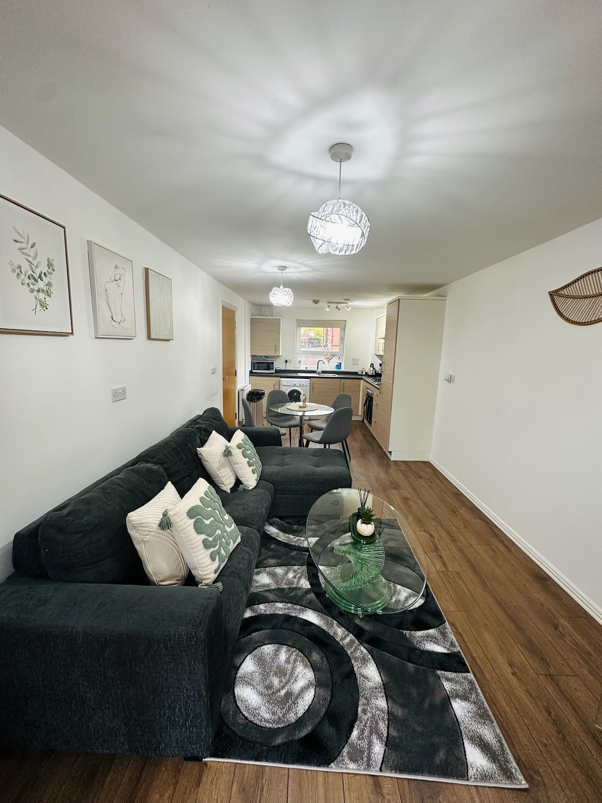 Luxury flat in centre of Poynton. Only 10 minutes from Manchester airport and a short walk to railway station offering good links to Manchester (20 mins) and London. Easy access to M56 and M60 motorways and beyond. Poynton is a bustling ‘village’ on the edge of Cheshire and close to The Peak District. Located centrally, the flat has numerous bars, restaurants and shops (including 3 supermarkets) right on its doorstep. Easy access to Middlewood Way, The Macclesfield Canal and Lyme Park.