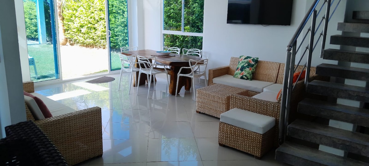 Cabaña Mandalay : Hemos diseñado esta casa pensando en la paz y comodidad. con su acogedora sala de estar hasta la terraza con vistas panorámicas, perfecta para tomar un cafe por la mañana o un coctel al atardecer. Aquí, cada día es una oportunidad para crear recuerdos inolvidables, ya sea con Una caminata hasta la playa , una cena bajo las estrellas o simplemente leyendo un buen libro en su jardín interior,a su llegada te invita relajarte en su piscina, y disfrutar de sus espacios verdes..