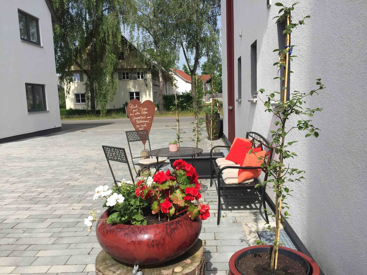 The maisonette with 2 balconies (midday and evening sun) and separate entrance invites you to experience the Ammersee: In 12 Min. you can take an idyllic stroll across fields (mountainview) to the Stegen bathing area with jetty, restaurants and beer gardens with evening sun! The location is ideal for cycling and swimming also in the Wörth and Pilsen lakes. The centre can be reached on foot in 6 Min.. Munich can be reached in ca. 25 Min. (35 km), Neuschwanstein and Zugspitze in approx. 90 Min.