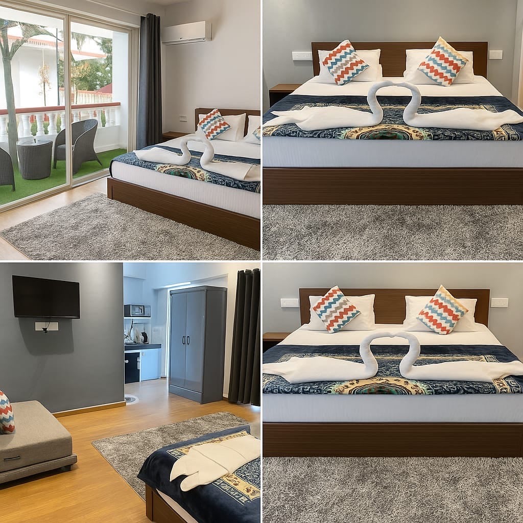 Sea Way Rooms – Beachfront Escape at Baga Wake up to the sound of the waves! Sea Way Rooms sits right on Baga Beach, with outdoor seating for every room perfect for soaking up the sea breeze and watching the sunset. Ideal for families, friends or small groups looking for a relaxed Goan getaway. What You’ll Love • Spacious AC rooms • Sit-out area with beautiful view • Double bed, fridge and LCD TV with cable • Bathroom with 24/7 hot water, fresh towels and toiletries • Reliable power backup