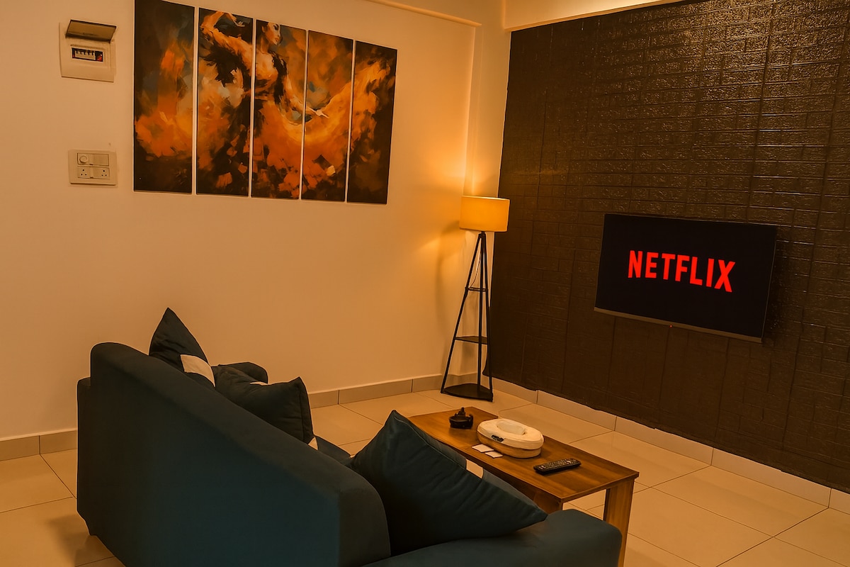 100 mbps Broadband. Upto 4 guests can stay comfortably in my 1bhk.2 dedicated caretakers 24 hrs available for your service, Clean Pool, automatic LIFT, daily cleaning, Towels, LPG gas, Fully Automatic Washing Machine, Cooking utensils, Inverter, Fridge, Microwave, Kettle,Egg boiler, Mixey, ,1 AC in flat. Geyser 5 ltrs, Flat screen 32 inch tata sky. Checkin checkout flexible. King size bed 7*6 ft with 10 inch branded mattress.
