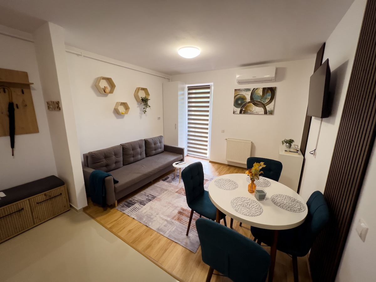 Apartament cu 2 camere, modern și primitor, ideal pentru cupluri sau călătorii singuri. Dormitor cu pat matrimonial, living open space cu TV, bucătărie practică și baie curată. Wi-Fi rapid, aer condiționat și check-in flexibil. 🐾 Pet friendly – animalele de companie sunt binevenite! Salina Turda la 10min de mers pe jos. Magazine si statie de autobuz aproape de cazare.