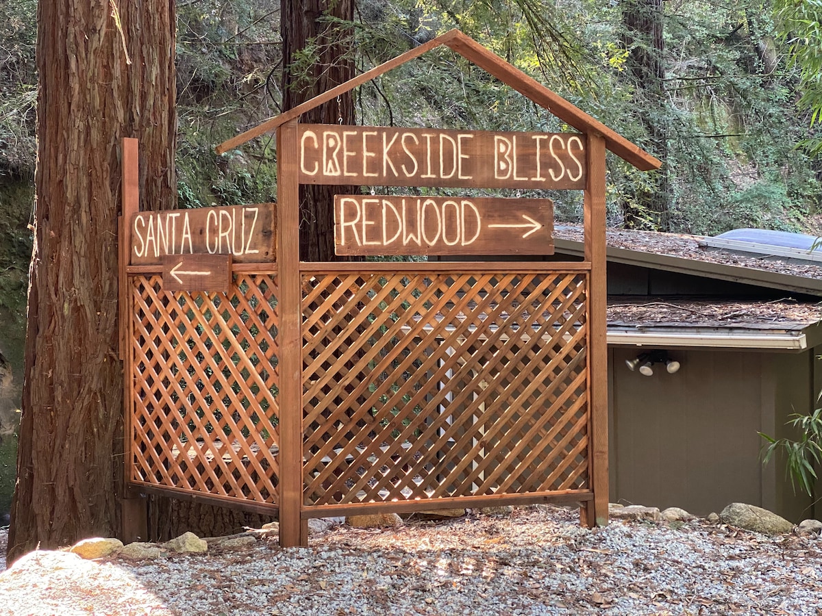 Santa Cruz County Vacation Rental Permit# 191283. Newly remolded beachy creek side cottage, bright and airy, fully equipped kitchen. Located in the Santa Cruz mountains 1/2 mile from downtown Boulder Creek on a secluded property. Close to many event and wedding venues. Fifteen minute drive to Big Basin State Park, 30 minutes to Santa Cruz and Beach Boardwalk, close to many wineries and lots of hiking trails. Twenty minutes from Roaring Camp Railroad.