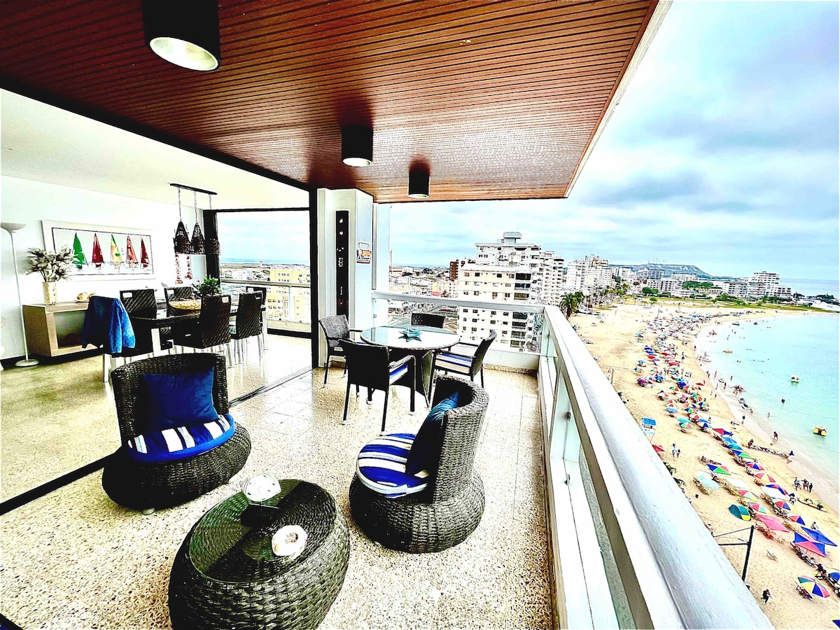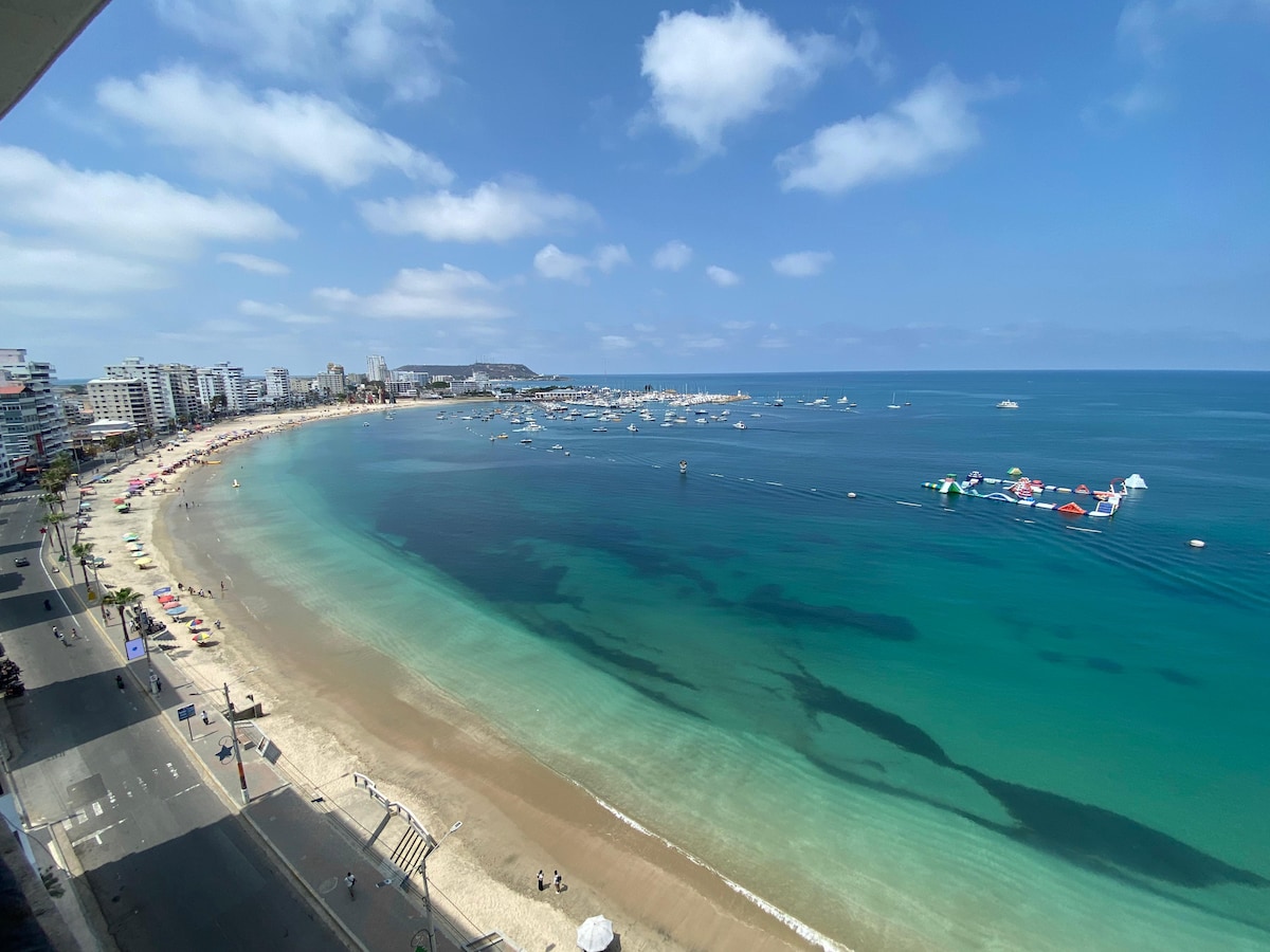 Beautiful spacious apartment in front of the beach. Wonderful ocean view. Located at Malecon Principal of Salinas, close to bars and restaurants. You can enjoy the sea with multiple activities such as swim, waverunner, boat ride, water parks and water sports. Reservations over 28 years old... PARTIES PROHIBITED