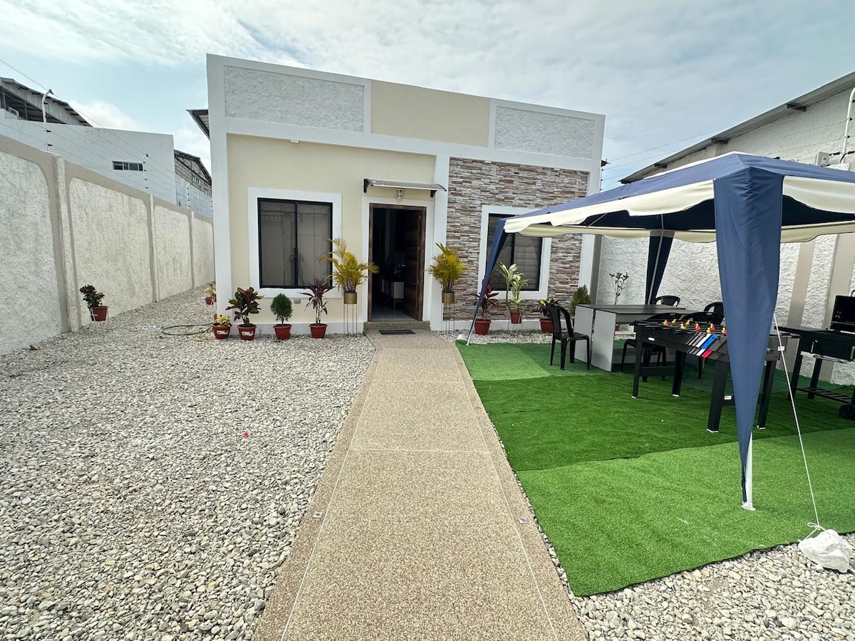 La casa se ubica en un sector tranquilo (sector Milina), en donde podrán disfrutar del fácil acceso a todo, muy cerca del mar. 7 minutos del malecón de Salinas, restaurantes, centros comerciales, Supermercado. En casa podrás disfrutar de gran espacio exterior, zona BBQ, espacio libre para tomar sol. Espacio cómodo para guardar todo lo que lleves. En el jardín podrás compartir con amigos, tomar el sol y hacer asados muy deliciosos. Estamos muy cerca de una playa tranquila.