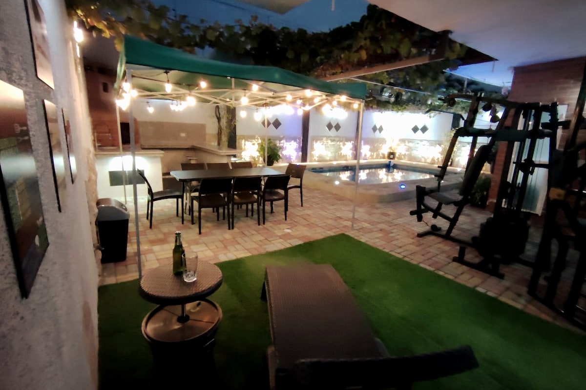 Escápate con familia o amigos. Disfruta de un ambiente amplio y tranquilo con jacuzzi, aire acondicionado, cocina equipada, TV con streaming, Wifi y parqueadero. Su capacidad es hasta 12 personas, con 3 dormitorios que incluyen una cama de 3 plazas y 4 literas de una plaza y media. En la parte posterior hay una acogedora área al aire libre con una sombrilla y mesa, ideal para disfrutar del clima cálido y relajarse. El espacio perfecto para comidas al aire libre o para tomar algo.