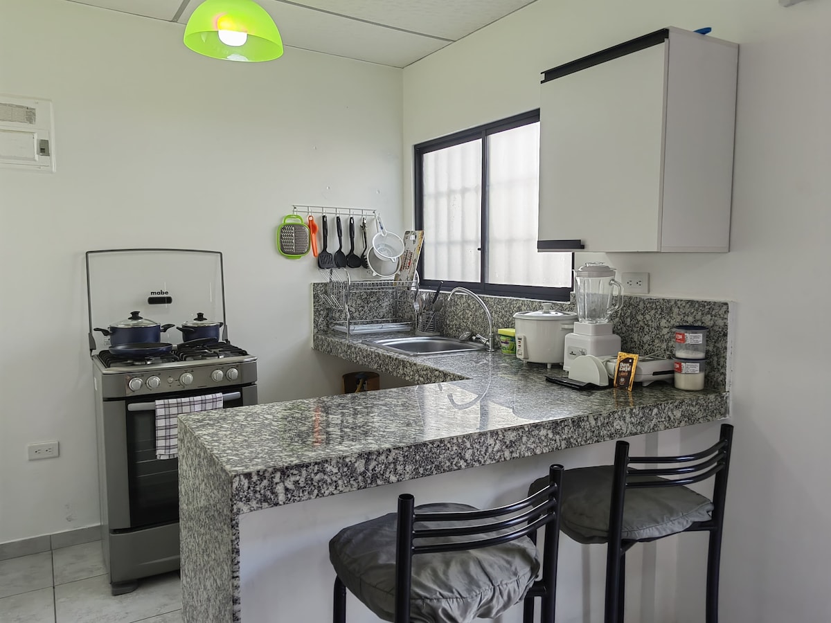 Disfruta de un hermosa suite nueva, con una habitación con cama queen size (2 1/2 plazas) closet, A/C split, baño privado especial para adultos mayores, cocina equipada full y sala con un sofá cama de 1 plaza y media y otro de 1 plaza. A/C split, TV con DVD player y servicio de TV por cable, con todas las comodidades, garaje, wifi, y dentro de una ciudadela cerrada y segura con guardianía 24/7, con acceso a piscinas y canchas de la urbanización y a 5 minutos de las playas de Punta Blanca.