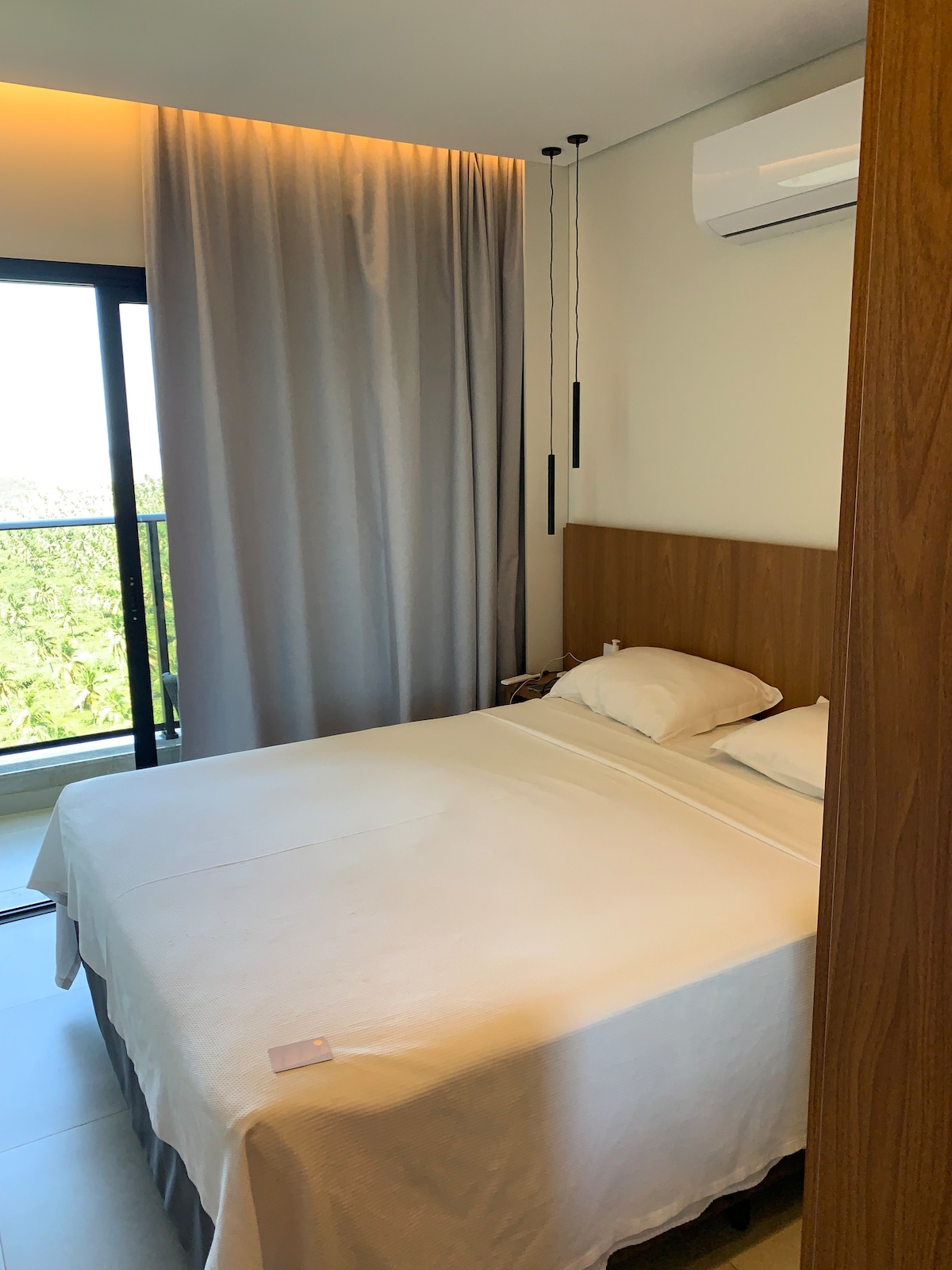 Apartamento smart de 30m2 mobiliado com cozinha americana e sala integrada. Sala com sofá cama e smart tv 40’’ e ar condicionado. Cozinha com balcão, banquetas, microondas, frigobar, cooktop elétrico e utensílios básicos (pratos, talheres, copos e panelas) 1 suíte com com cama de casal e uma bicama, ar condicionado 1 quarto com uma cama de solteiro e uma bicama 1 banheiro social Wi-Fi gratuito no apartamento e áreas sociais.