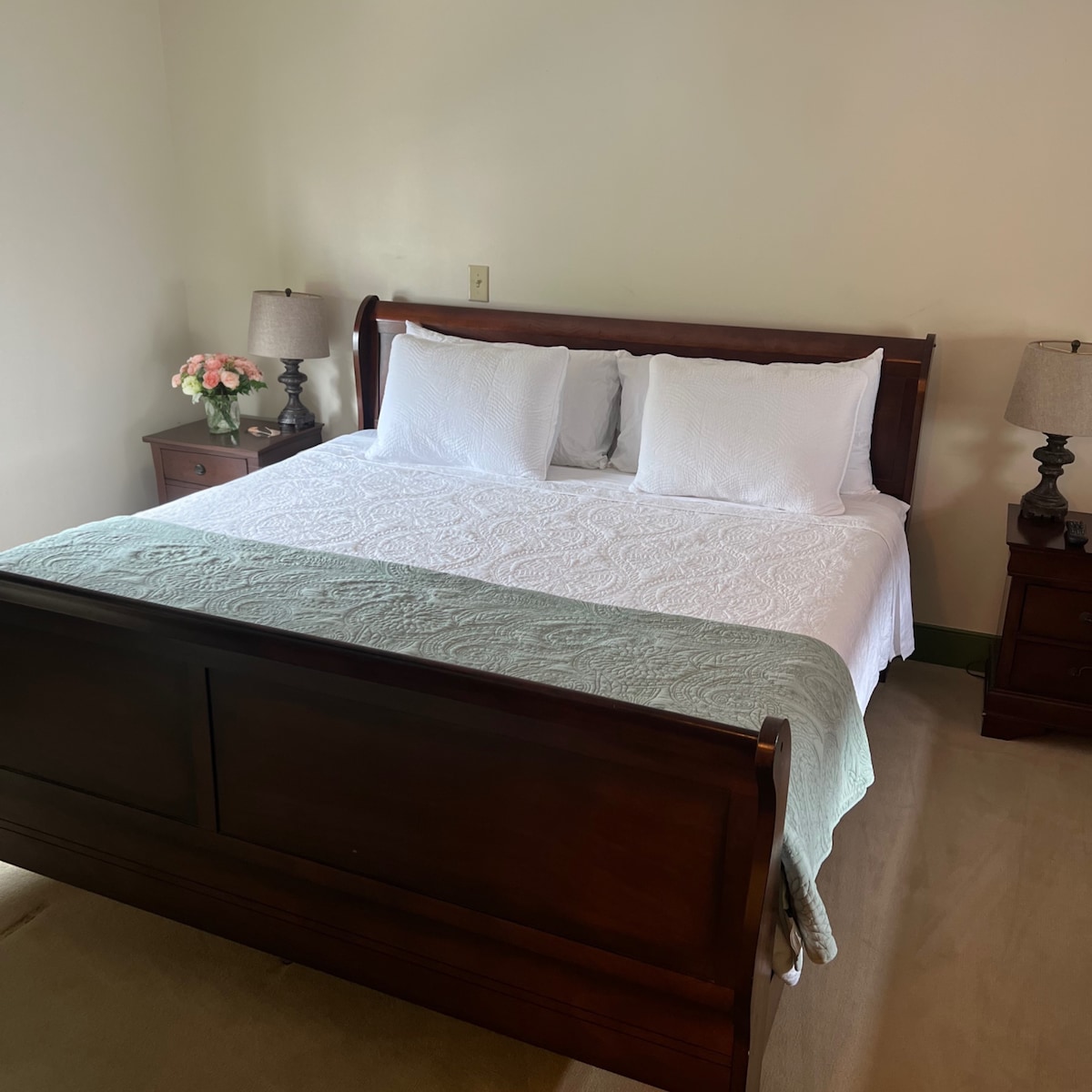 The cozy loft is located above the apiary workshop. It is a spacious, kind suite with a walk-in bath featuring a rainforest shower. Windows overlook the donkey pasture, river, farm, and gardens. Designed for a true retreat, there is no WiFi, TV, or smoking. For breakfast, travel on over to Sugar Water Restaurant to have a free breakfast with coffee, tea, juice, and more. The Loft includes a small refrigerator plus coffee and tea essentials. Please note: children are not permitted.