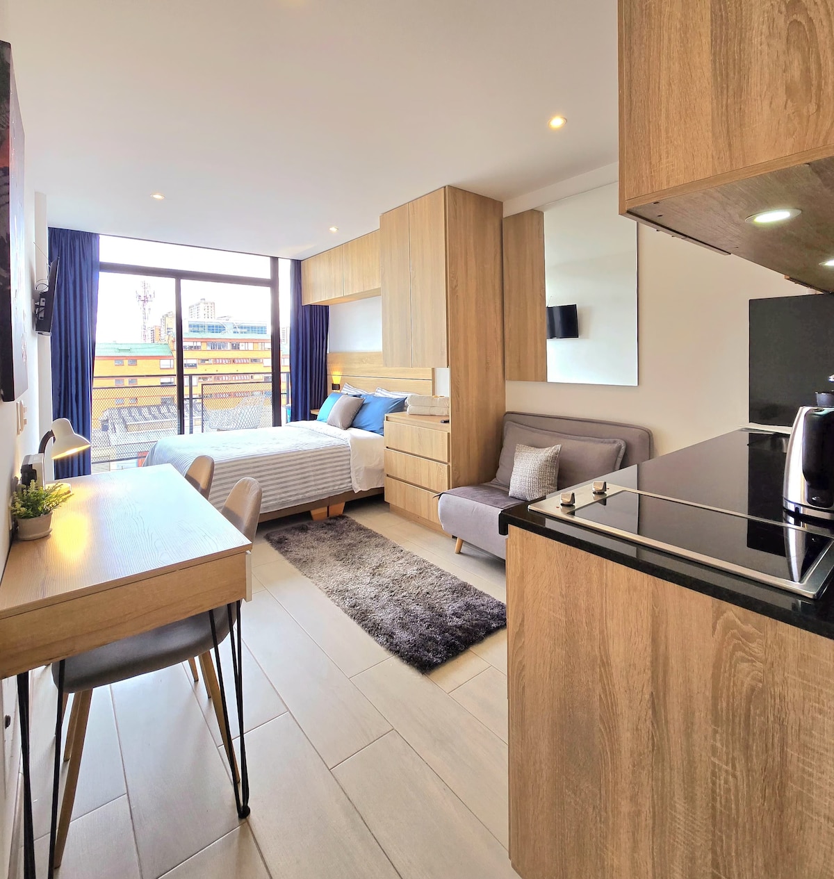 Disfruta de una experiencia con estilo en este aparta estudio nuevo y cómodo, con habitación luminosa, baño moderno, cocina equipada, sofá cama y escritorio. Ubicado en zona céntrica y tranquila de Bogotá, cercano a toda la zona de eventos de la ciudad parque Simón Bolívar, Movistar Arena, campin, vive claro, Salitre Mágico y más. A pocos minutos de centros comerciales, restaurantes, bares y a 20 min del aeropuerto y del centro. Ideal para caminar y disfrutar de zonas verdes y recreativas.