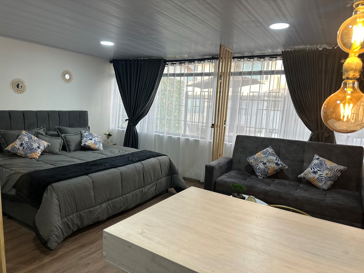 Cozy, Central, and Safe Loft! Just 10 minutes from the airport and 5 minutes from the El Salitre bus terminal. Perfect for couples seeking privacy and comfort. Enjoy your own furnished outdoor terrace, perfect for relaxing and soaking up some fresh air. You’ll be surrounded by over 15 restaurants, grocery stores, bakeries, banks, and 2 shopping malls. Ideal for your American visa process, CAS just 7 minutes away.