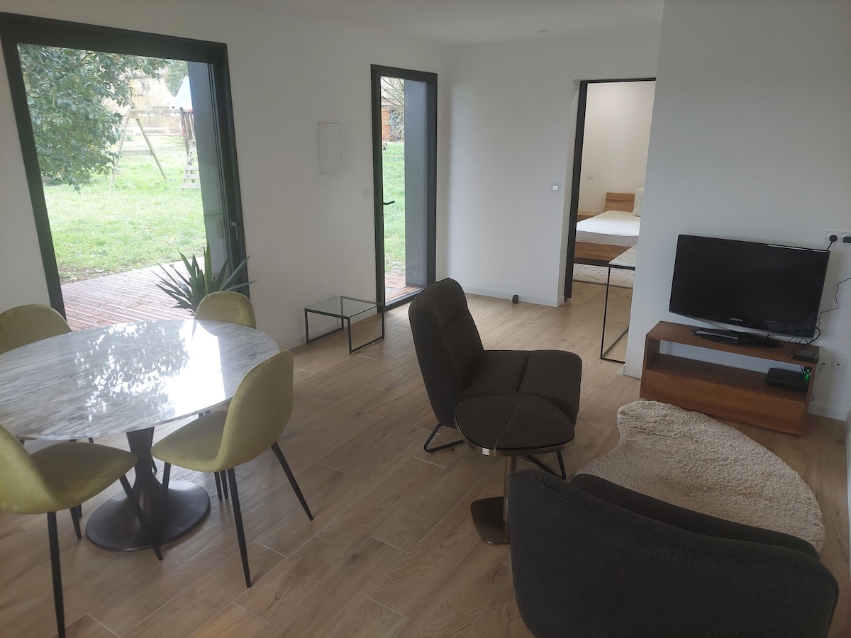 A 15 minutes du centre de Bordeaux, dans un environnement calme et verdoyant, maison (dépendance) de 42m^2 dans un style chaleureux et contemporain. La maison comprend une chambre avec lit double, une salle d'eau et un salon/salle à manger doté d'un couchage supplémentaire (canapé lit convertible). Vous pourrez profiter de la piscine aux beaux jours. Afin de respecter la tranquillité du voisinage, les fêtes sont interdites. La capacité maximale est de 4 personnes.