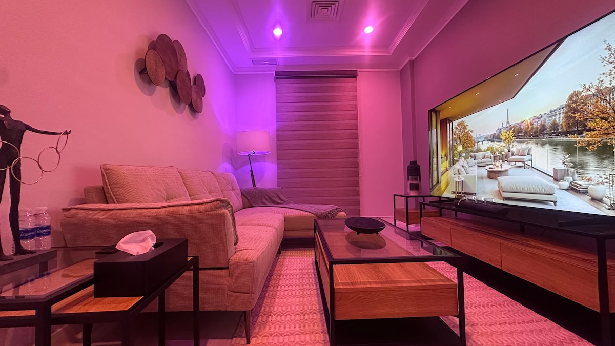 影院风格的住宿:100 英寸电视和舒适的沙发体验