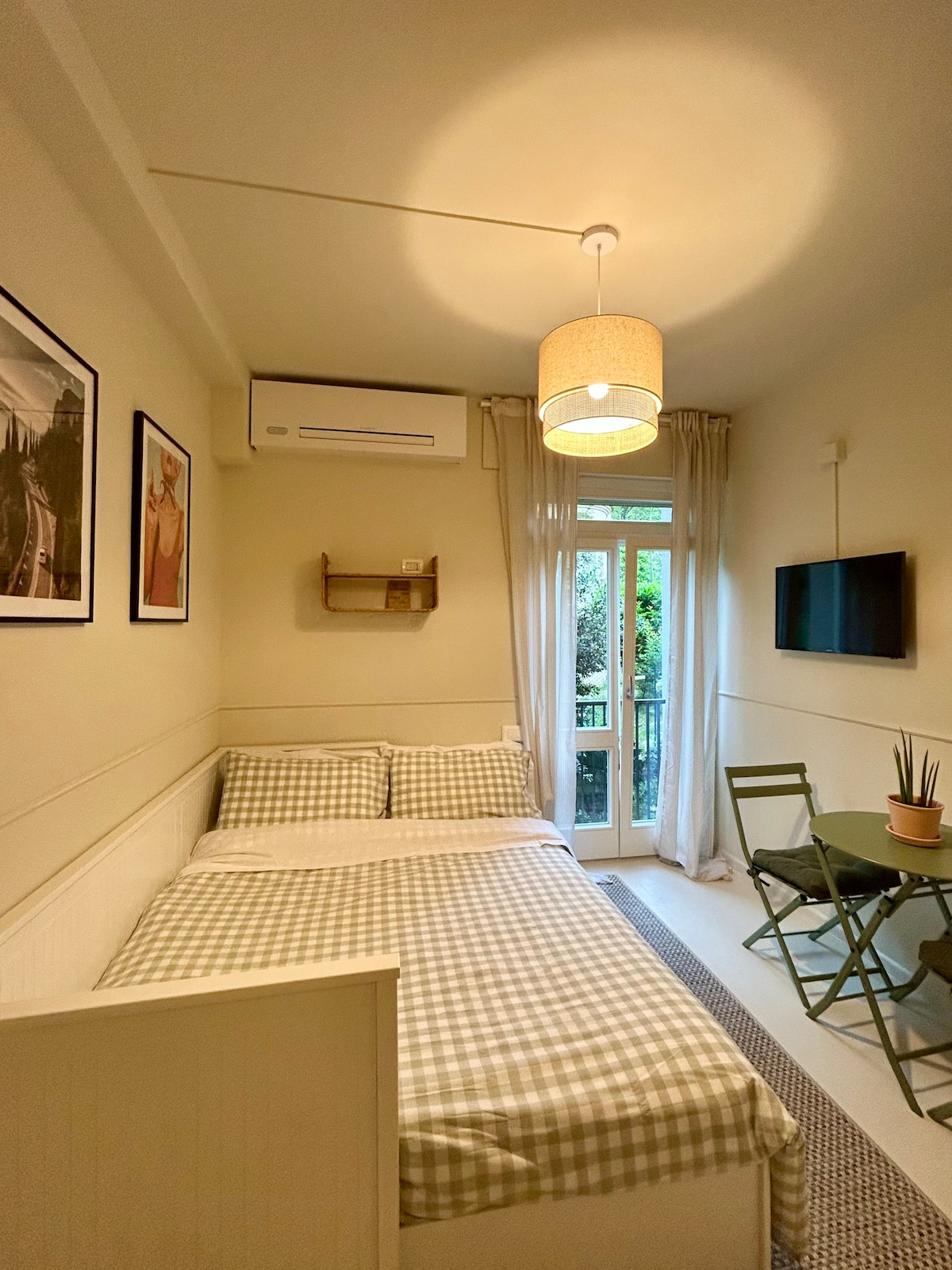 In the apartment there are four places: a double bed in the bedroom on the mezzanine and two single beds in the living room ( one bed is normally used as a sofa, the other is a sliding bed) The apartment is air conditioned.