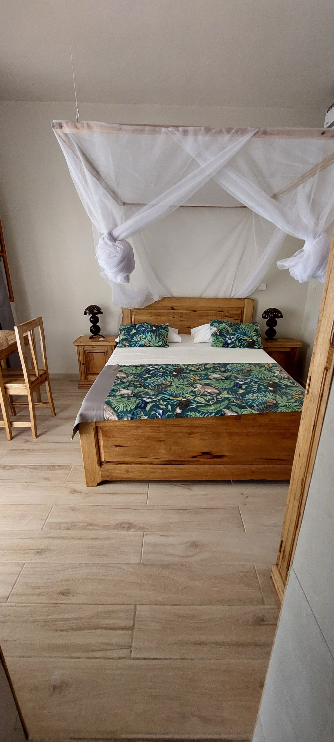 Maison d'hôtes Le Paradis avec capacité d'accueil actuelle de 4 chambres avec chacune salle d'eau avec wc. Les lits de 160x190 sont équipés d'une moustiquaire. Les chambres sont fraîches néanmoins à votre disposition un ventilateur sur pied. Une piscine de 6.70 x 4 m pour vous rafraîchir et des espaces ombragés pour vous détendre
