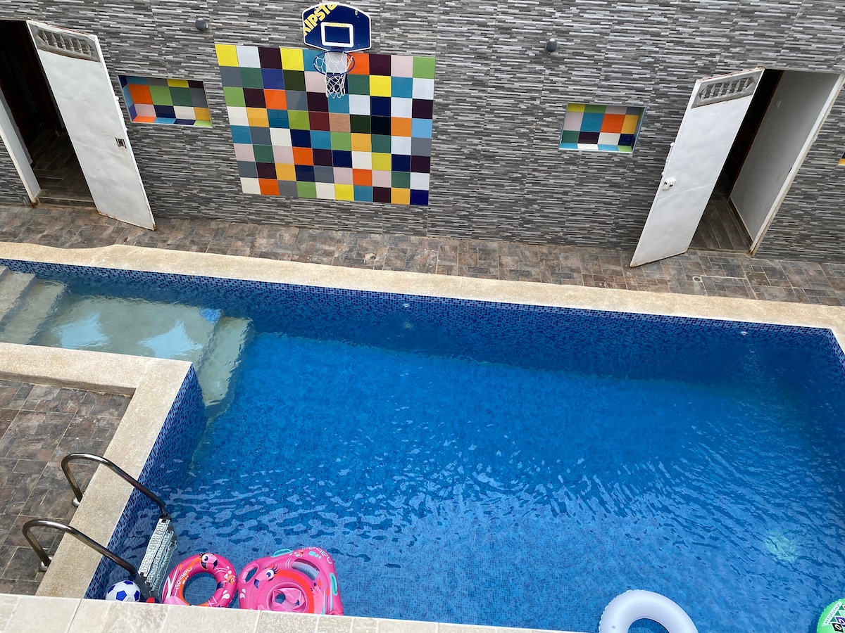 Très belle villa neuve de 140m2 sur 1100m2 de terrain. Grand séjour/salon, cuisine, 4 chambres toutes les chambres ont la climatisation (tous les lits possèdent une moustiquaire individuelle), 3 salles de bain, 2 WC Grande piscine privée de 12 par 4 avec sa plage californienne et son bar, un jardin engazonné et arboré ainsi qu'un magnifique jardin tropical. Électricité à charge du locataire, Au delà de 6 pers, une seconde employée sera ajouté à charge du locataire (5000 cfa/jour