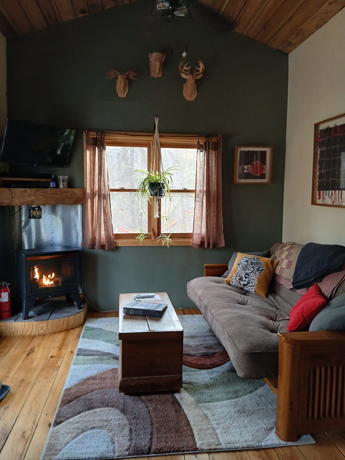 Come and visit our clean and cozy one bedroom cabin in the wooded hills of Guernsey county Ohio and relax on the spacious deck and listen to the sounds of nature, take a trail walk on the 19 acre property, or stay inside and ask Alexa to play your favorite tunes or stream a blockbuster movie on the 65" 4k UHD TV with 7.2.4 Dolby Atmos surround sound, the choice is yours.