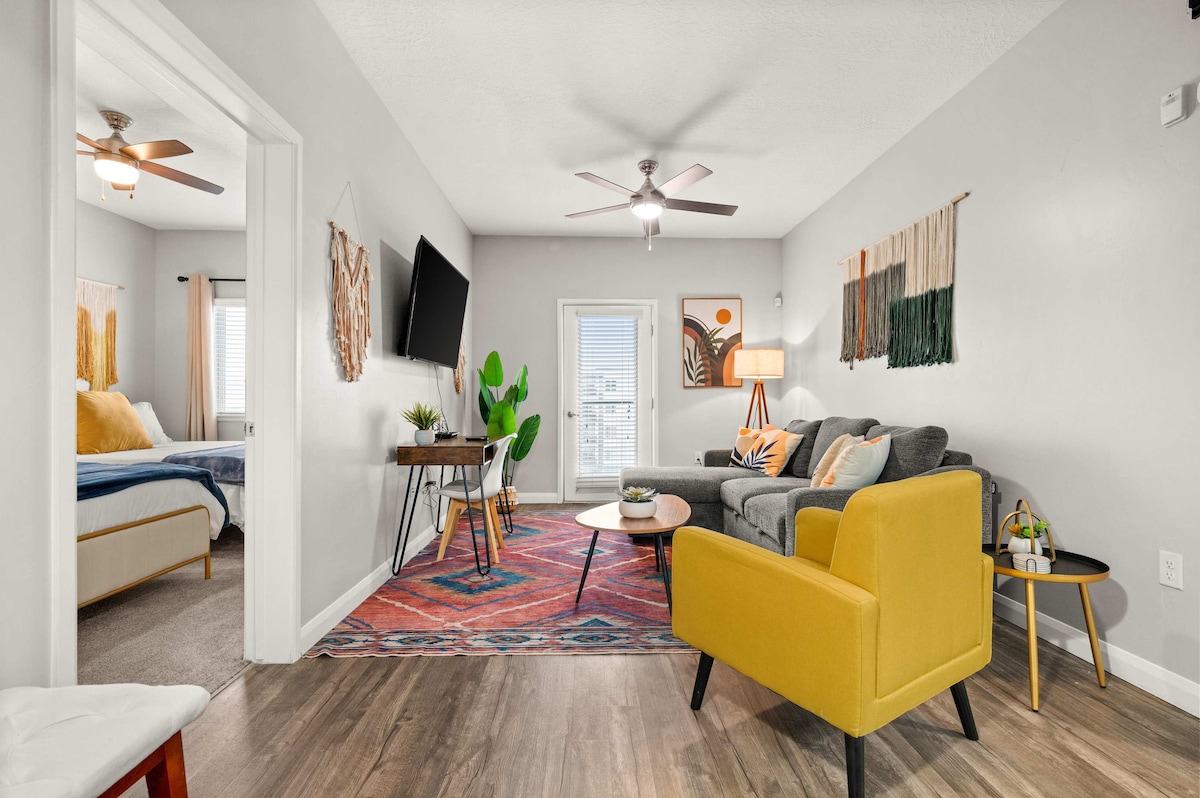 Experience luxury in our spacious apartment located in the heart of SLC. Enjoy stunning mountain views from the open floor plan and modern bohemian decor of the spacious living area with a large flat-screen TV. The fully equipped kitchen and en-suite bathroom with a luxurious shower make your stay comfortable. The central location puts you just steps away from restaurants, bars, entertainment venues, university, hospitals and convention centers. Book now and enjoy the best of Salt Lake City.