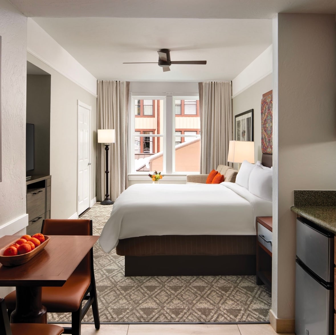 This studio features a comfortable king-size bed with a large flat-screen TV plus a well-equipped kitchenette, dining space and full bath. Additional amenities include a 24-hour fitness center, year-round heated pool and hot tubs, dry sauna, full-service spa, complimentary underground parking, ski valet, child care, concierge services and free local bus system, all conveniently located steps away from the Orange Bubble Express and Red Pine Gondola.