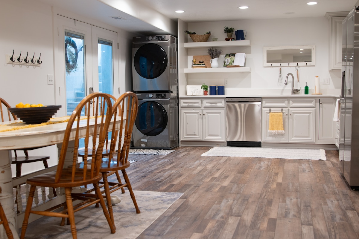 Being away from home can be UNCOMFORTABLE! But it doesn't have to be. This adorable basement apt is perfect whether you're visiting family, working remotely, or need a night away. You get the feel of a boutique hotel with the privacy of a quiet neighborhood and all the comforts of home (parking w/o the awkward backyard entry, full kitchen & laundry, Zoom-friendly workspaces, etc). PLUS you're centrally located for both Utah and Salt Lake counties and just minutes from the mountains!