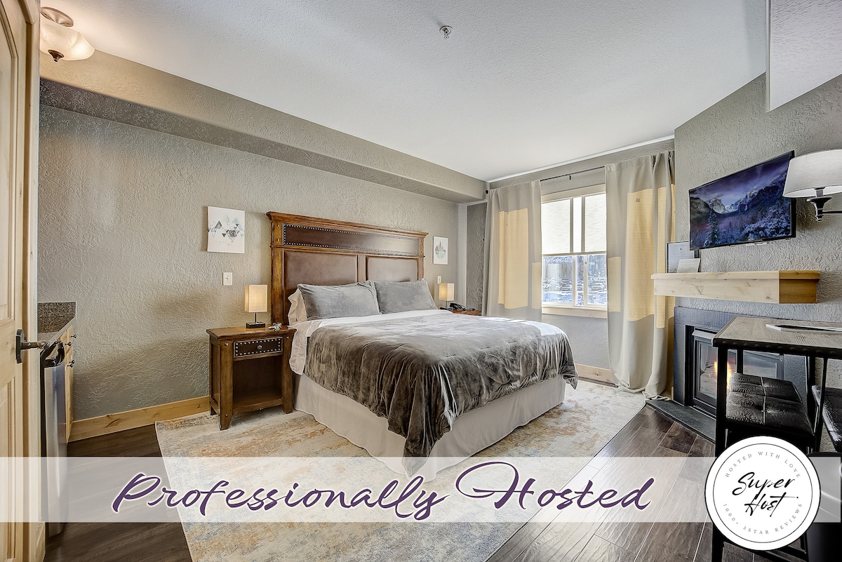 SKI HERE, STAY HERE! 4th floor King Hotel Room, remodeled flooring, paint, blinds. Relaxing Master spa bath with jetted tub, organic B&B, bath salts, bubbles, luxury towels, robes and glass shower. Kitchenette w/mini fridge, microwave, toaster oven, kettle, Keurig, plates, utensils, etc. Luxury linens, NEW Serta pillow top king bed, with Mtn views! Fireplace, cable TV w/HBO & Showtime. Bistro table and benches offer a great space to eat, work or relax. Built-in closets.