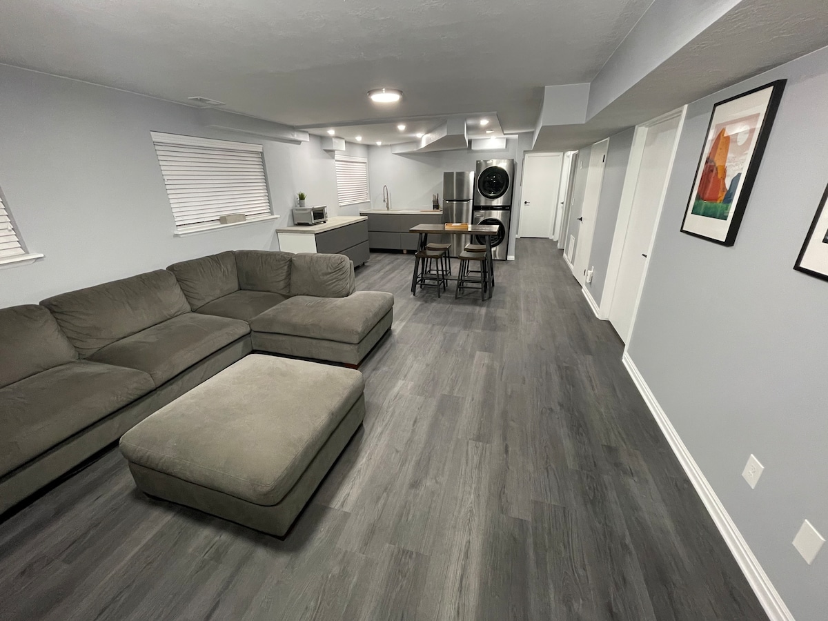 Bring the whole family to this great place with lots of room for fun! Entire basement suite with single car garage. Theater room for the tired nights of traveling and feel like playing games or watching a movie.Queen bed and memory foam futon bed. Wet bar w/ microwave, air fryer, mini fridge, coffee maker, Free wifi, Washer Dryer, Fireplace. Enjoy this unique basement designed for relaxing and having fun! 900 sq. ft. all to yourselves! Minutes from Usana amphitheater, Airport, and Downtown SLC