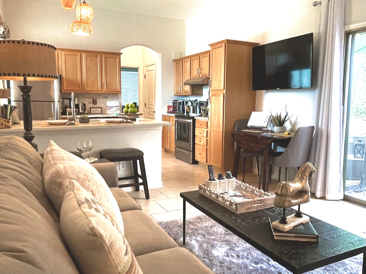 Heated pool, 8 seat hot tub, outdoor fireplace, and lots of patios to relax. The outdoor kitchen has a pizza oven, bbq, hot water sink, gas stove and oven, smoker and is a perfect place to enjoy. This place is close to restaurants, hiking, lakes and evening fun. Lots of trees: orange, grapefruit, key limes, lemons, pomegranate, figs, dates, grapes and there is a juicer for morning fresh juices. Safe, quiet, and has many hummingbirds and two giant (50 & 80 pound) tortoises.