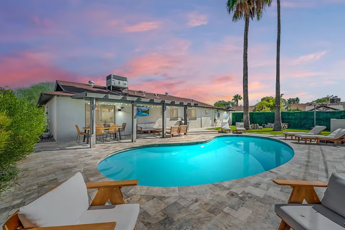 Step into your Dreamy Desert Oasis! Spend hours relaxing in the resort-style backyard, taking a dip in the pool, watching TV on not one but two of the outdoor TV's, putting around on the putting green, playing a game of pickle-ball, & lounging in the many outdoor seating areas. Let your stress slip away in this Scottsdale oasis. Inside the home features brand new renovation & furnishing throughout! The open layout floor plan provides plenty of space for groups to spend their getaway comfortably.
